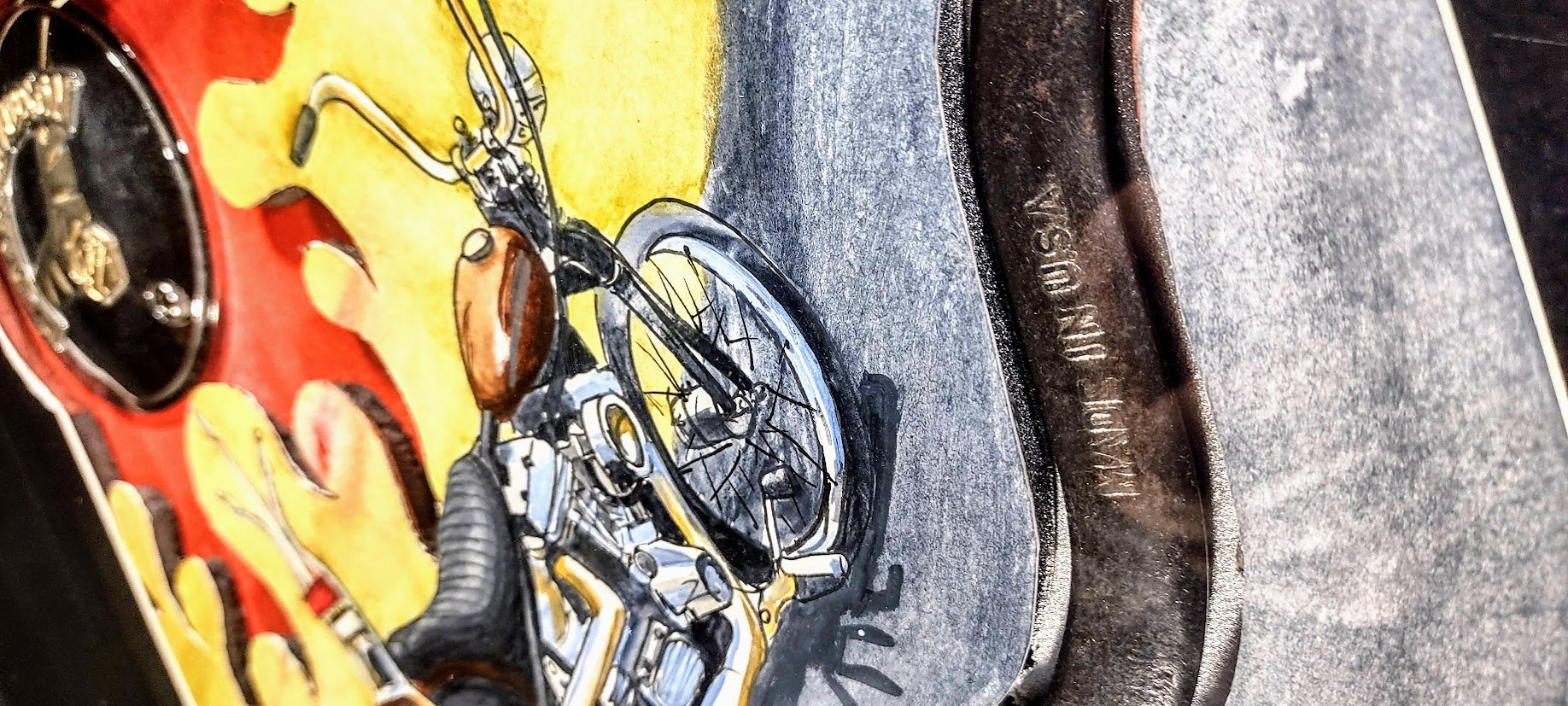 8' X 10" MULTIMEDIA IN A SHADOW BOX. ORIGINAL HARLEY EVO TIMING COVER AND MADE IN USA "S" WRENCH