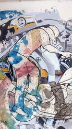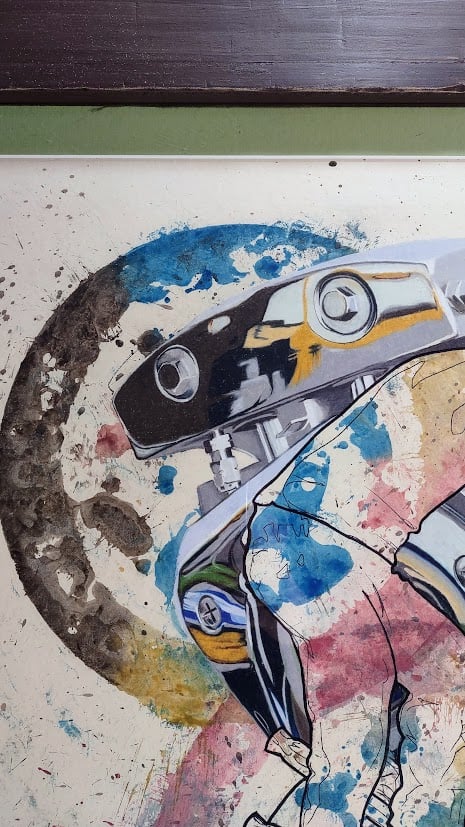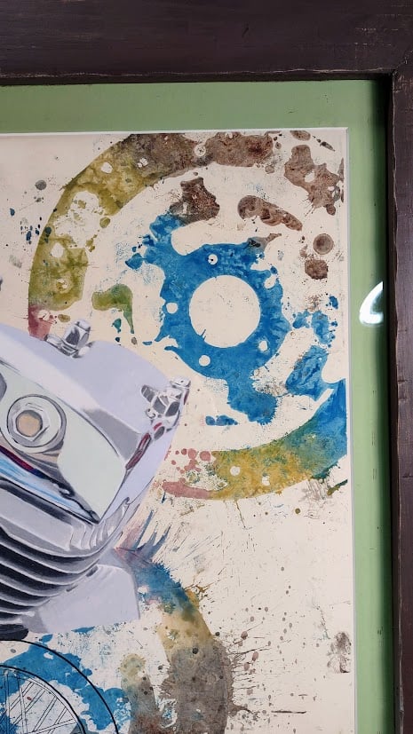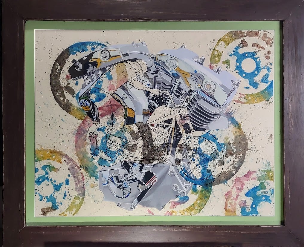 This multi-media design has more to see the more you look at it. The motor is colored pencil, the brake rotor splash is watercolor, and the outline is in ink. The frame was done by me. 37" x 45"